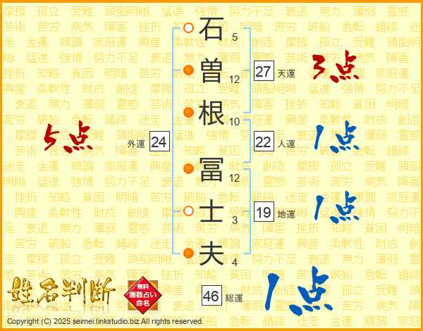 石(5画)曽(12画)根(10画) 冨(12画)士(3画)夫(4画)