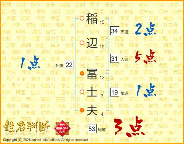 稲(15画)辺(19画) 冨(12画)士(3画)夫(4画)