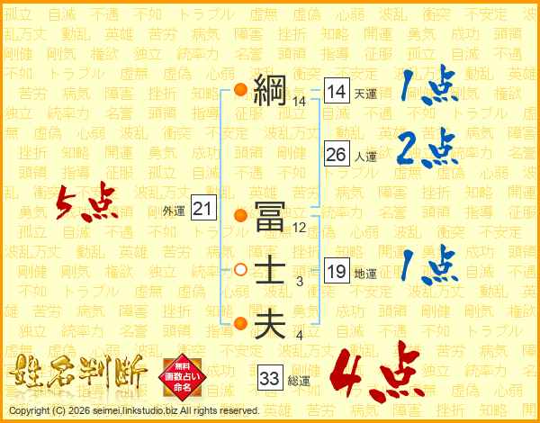 綱(14画) 冨(12画)士(3画)夫(4画)