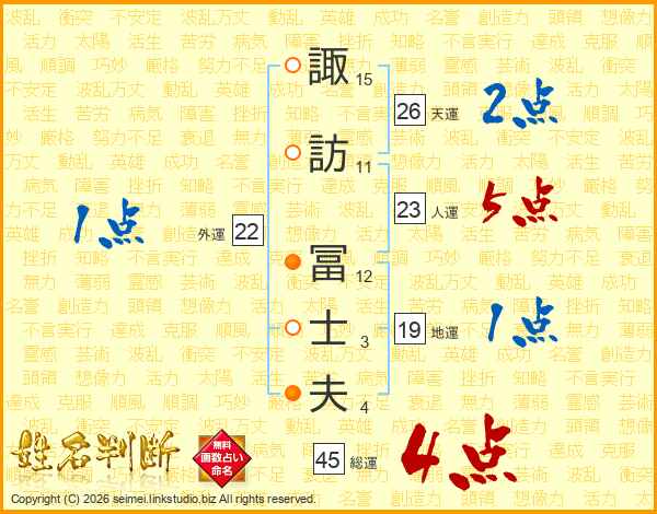 諏(15画)訪(11画) 冨(12画)士(3画)夫(4画)