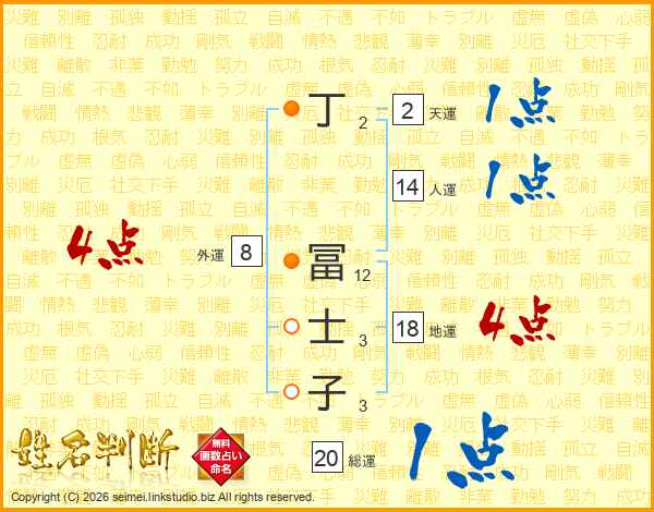 生活面を象徴する運勢です。外部から受ける影響力を表し、結婚運、家庭運や職場、環境への順応性を表します。総運から人運を引いた画数。姓や名が1文字の場合を除く。