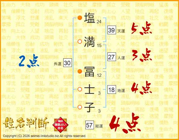 塩(24画)満(15画) 冨(12画)士(3画)子(3画)