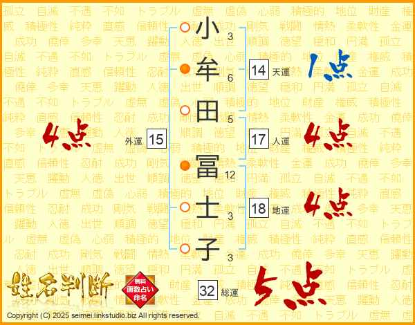小牟田冨士子さんの総運は32画の5点!
