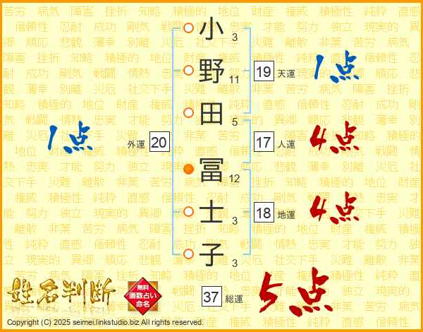 小野田冨士子さんの総運は37画の5点!