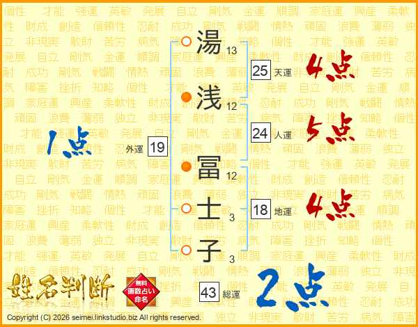 湯(13画)浅(12画) 冨(12画)士(3画)子(3画)