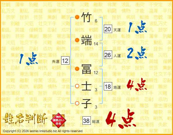 竹(6画)端(14画) 冨(12画)士(3画)子(3画)