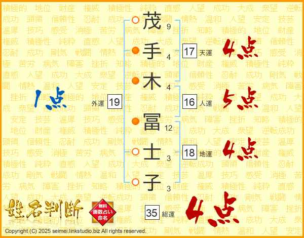 茂(9画)手(4画)木(4画) 冨(12画)士(3画)子(3画)