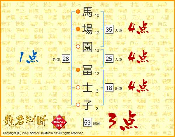 馬(10画)場(12画)園(13画) 冨(12画)士(3画)子(3画)