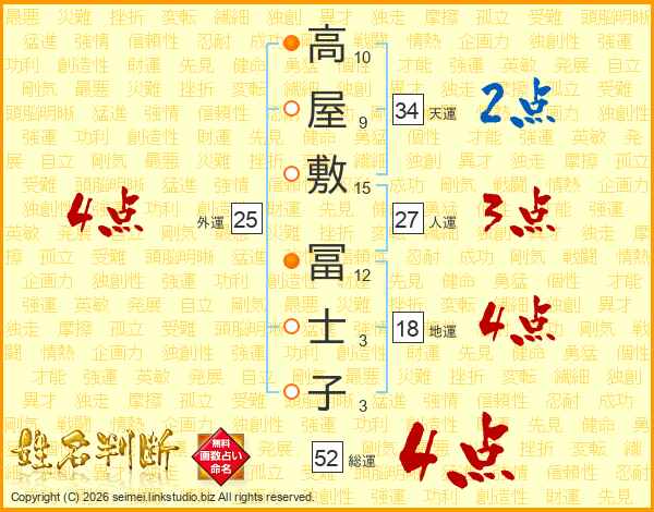 高屋敷冨士子さんの総運は52画の4点!