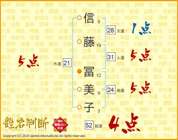 信(9画)藤(19画)  冨(12画)美(9画)子(3画)