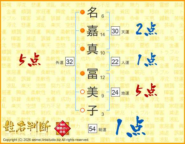 名(6画)嘉(14画)真(10画) 冨(12画)美(9画)子(3画)