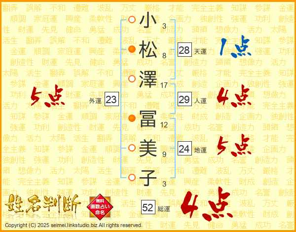 小(3画)松(8画)澤(17画)  冨(12画)美(9画)子(3画)