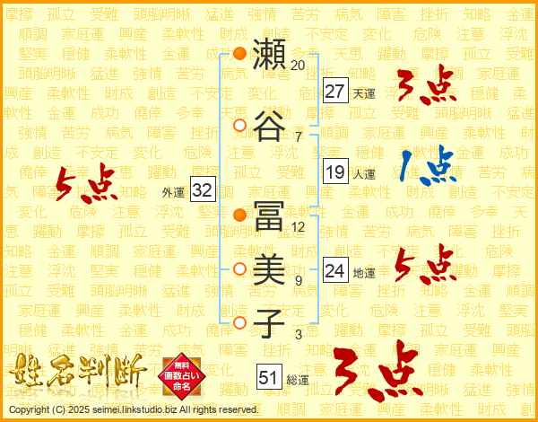 瀬(20画)谷(7画) 冨(12画)美(9画)子(3画)