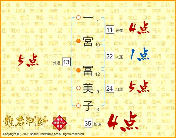 一(1画)宮(10画) 冨(12画)美(9画)子(3画)