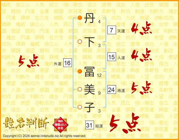 丹(4画)下(3画) 冨(12画)美(9画)子(3画)