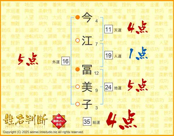 今(4画)江(7画) 冨(12画)美(9画)子(3画)
