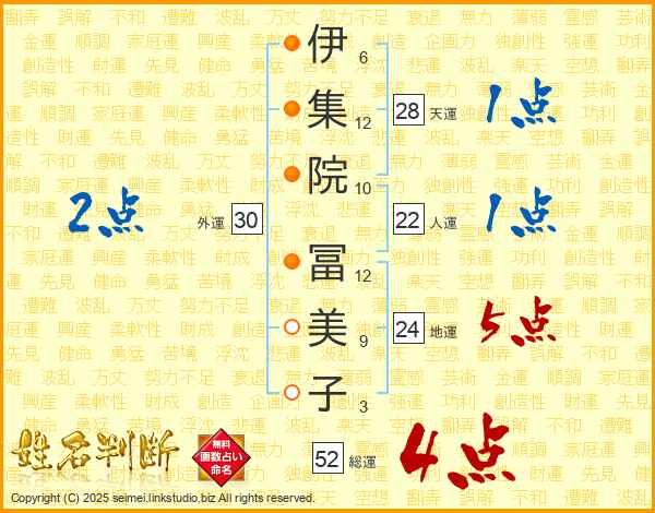 伊(6画)集(12画)院(10画) 冨(12画)美(9画)子(3画)