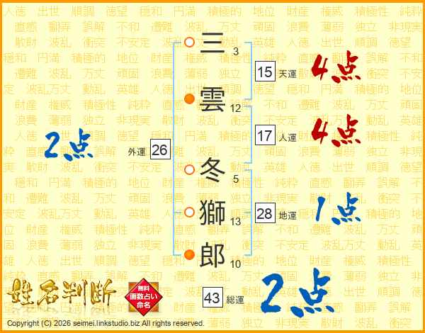 三雲冬獅郎さんの総運は43画の2点!