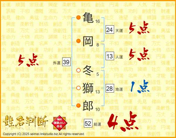 亀(16画)岡(8画) 冬(5画)獅(13画)郎(10画)