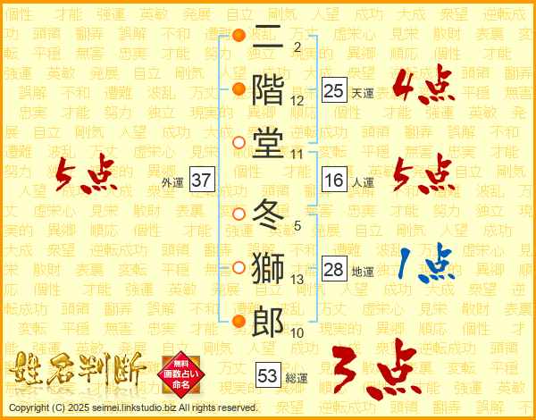 二(2画)階(12画)堂(11画) 冬(5画)獅(13画)郎(10画)