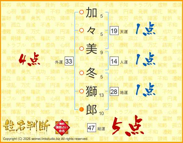 加(5画)々(5画)美(9画) 冬(5画)獅(13画)郎(10画)