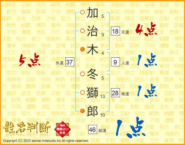 加(5画)治(9画)木(4画) 冬(5画)獅(13画)郎(10画)