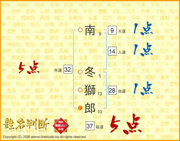南(9画) 冬(5画)獅(13画)郎(10画)