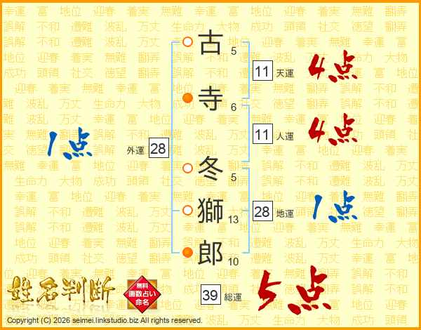 古(5画)寺(6画) 冬(5画)獅(13画)郎(10画)