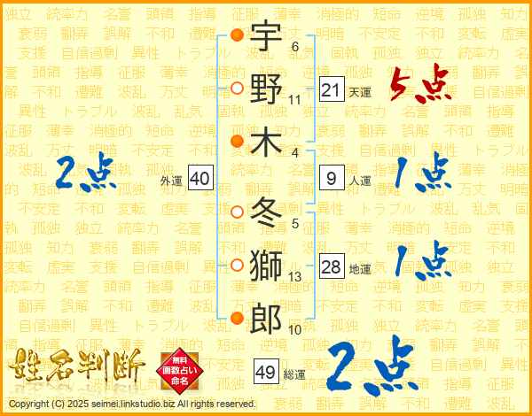 宇野木冬獅郎さんの総運は49画の2点!