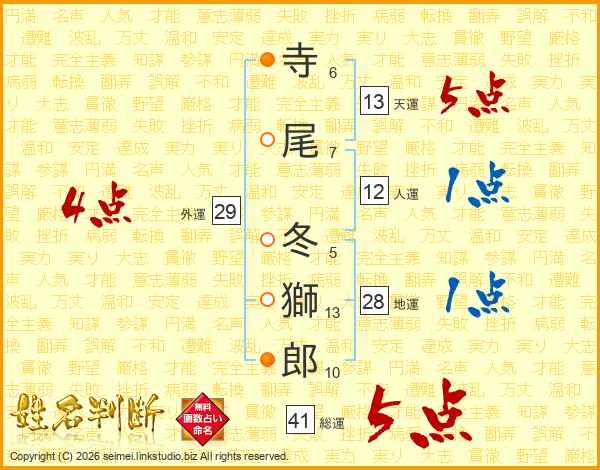 寺(6画)尾(7画) 冬(5画)獅(13画)郎(10画)