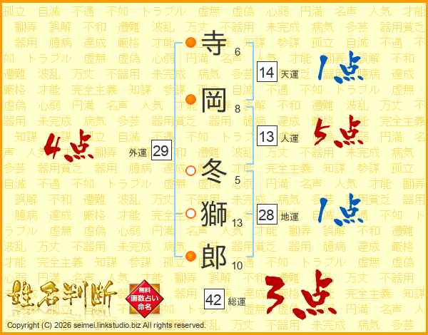 寺(6画)岡(8画) 冬(5画)獅(13画)郎(10画)