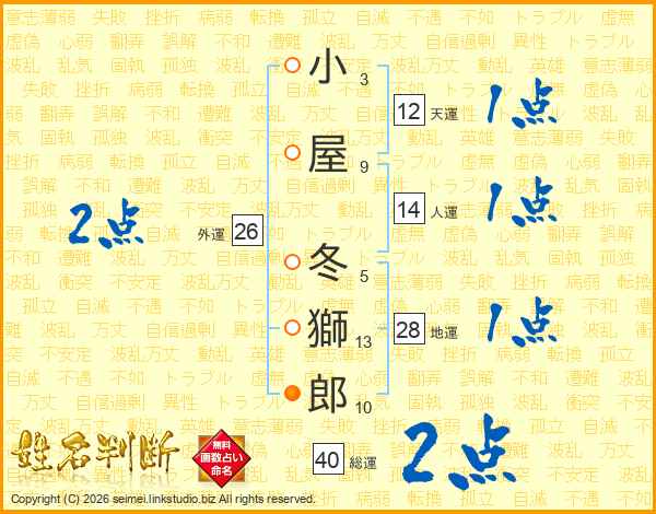 小(3画)屋(9画) 冬(5画)獅(13画)郎(10画)