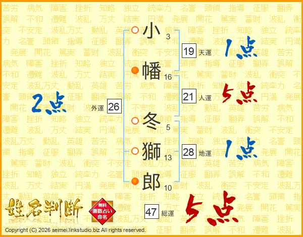 小(3画)幡(16画) 冬(5画)獅(13画)郎(10画)