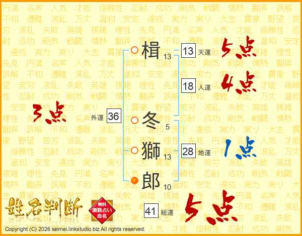 楫冬獅郎さんの総運は41画の5点!