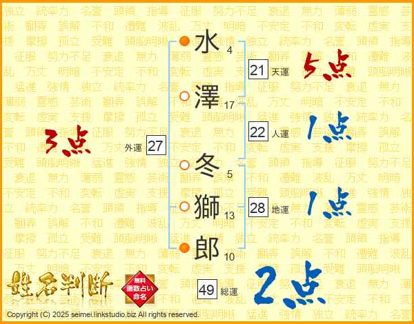 水(4画)澤(17画) 冬(5画)獅(13画)郎(10画)