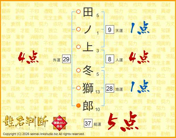 田ノ上冬獅郎さんの総運は37画の5点!