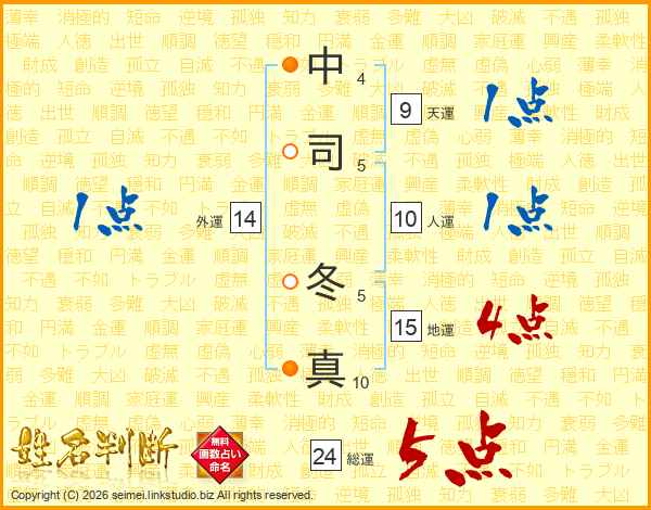 あなたの人生を表す1番重要な運勢です。生涯を通じて影響する総合運となり、主に50歳以降の晩年期に影響を及ぼします。苗字と名前の合計画数。