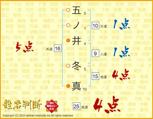 五(5画)ノ(1画)井(4画) 冬(5画)真(10画)