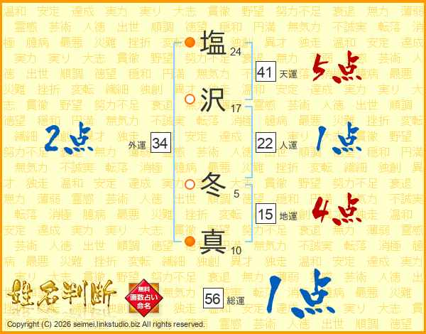 塩(24画)沢(17画) 冬(5画)真(10画)