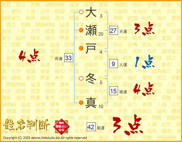 大(3画)瀬(20画)戸(4画) 冬(5画)真(10画)