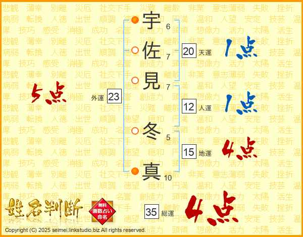 宇(6画)佐(7画)見(7画) 冬(5画)真(10画)