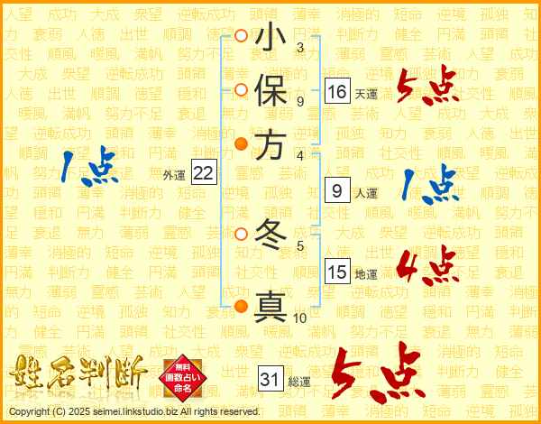 生活面を象徴する運勢です。外部から受ける影響力を表し、結婚運、家庭運や職場、環境への順応性を表します。総運から人運を引いた画数。姓や名が1文字の場合を除く。