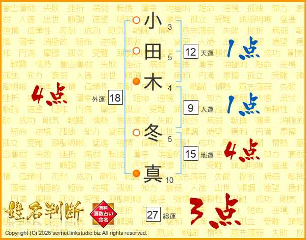 小(3画)田(5画)木(4画) 冬(5画)真(10画)