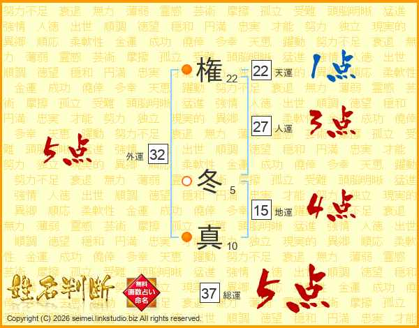 権冬真さんの総運は37画の5点!