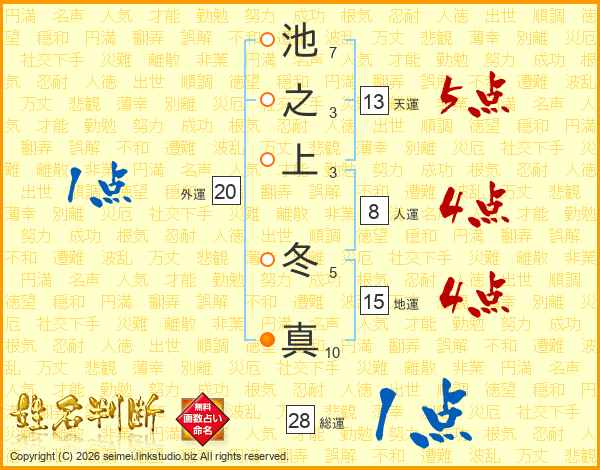 生活面を象徴する運勢です。外部から受ける影響力を表し、結婚運、家庭運や職場、環境への順応性を表します。総運から人運を引いた画数。姓や名が1文字の場合を除く。