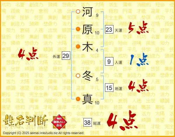 生活面を象徴する運勢です。外部から受ける影響力を表し、結婚運、家庭運や職場、環境への順応性を表します。総運から人運を引いた画数。姓や名が1文字の場合を除く。