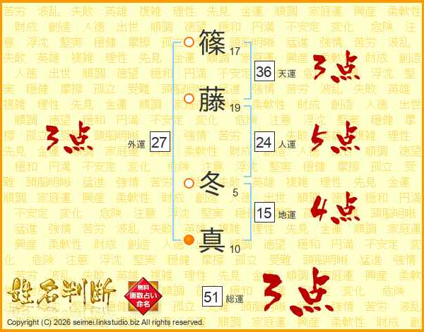 篠(17画)藤(19画) 冬(5画)真(10画)