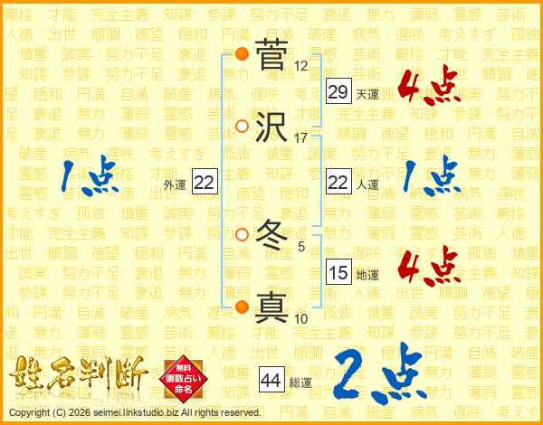 菅沢冬真さんの総運は44画の2点!