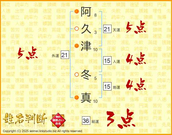 阿(8画)久(3画)津(10画) 冬(5画)真(10画)