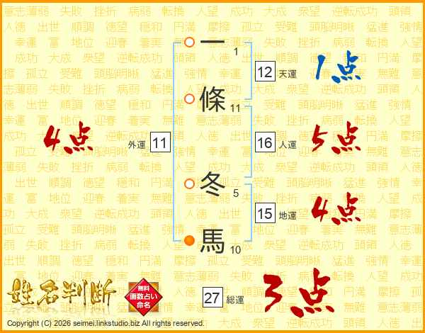 一條冬馬さんの総運は27画の3点!